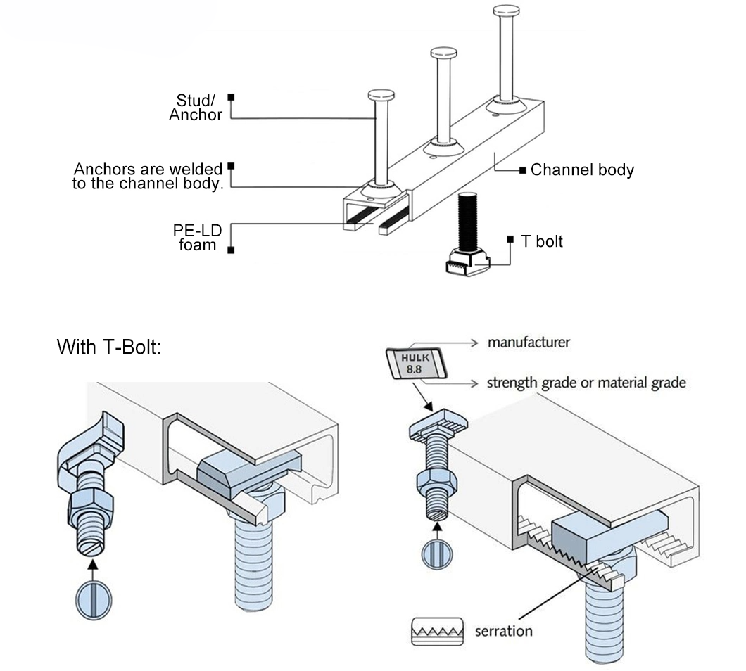 Cast in channel trough is a general professional embedded part used in construction, and it is an indispensable embedded device. First embed the C-shaped slot into the concrete, then buckle the big head of the T-shaped bolt into the C-shaped slot, and finally fix the parts of the device with the T-shaped bolt. The unique shape allows for the transfer of applied loads directly from the lip of the slot to the anchor, and the more compact cross-sectional dimensions improve the fit between the bars. Specially designed T-head bolts run up the sloped sides of the channel and lock securely behind the front lip. The precast channels are filled with continuously extruded closed-cell PE-LD foam. This material is easily removed in longer sections and is 100% recyclable. The C-channel is made of hot-dip galvanized Q235 carbon steel with at least two anchors on the back. Our materials are purchased from major Chinese manufacturers such as Hesteel, Baosteel, Masteel, etc. to ensure quality, stability, and consistency.